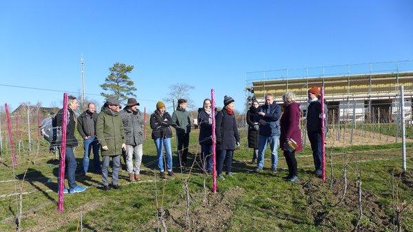 Nach einem Vortragsteil ging es in die Weinberge. Zuerst besichtigten die Gäste den Weinberg Waladala in Bernburg, ein Versuchsweinberg der Hochschule Anhalt. Prof. Dr. Dieter Orzessek, Rektor im Ruhestand der Hochschule Anhalt, betreut ihn ehrenamtlich. Eine weitere Station war ein Weinberg des Weingutes Born bei Höhnstedt nahe des Süßen Sees. Seit 2021 nehmen Elisabeth und Jochen Born an dem Projekt LIFE VineAdapt teil. Im Rahmen des Projektes wurden die Weinberggassen in den teilnehmenden Weinbergen begrünt. Gewöhnliche Wegwarte, Saat-Mohn, Wiesen-Flockenblume und Co. ergeben im Sommer ein buntes Bild zwischen den Weinstöcken. Diese Pflanzen sehen aber nicht nur schön aus. Sie ziehen u. a. Insekten an, die Schädlinge vertilgen und andere Pflanzen bestäuben. Durch ihre Wurzeln stärken die Pflanzen den Boden, so dass dieser bei starkem Regen nicht so leicht weggeschwemmt wird. Außerdem schützt eine Vegetationsdecke zwischen den Weinstöcken den Boden vor starker Austrocknung.